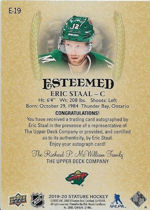 2019-20 Upper Deck Stature Eric Staal Esteemed Autographed E-19 1:84 packs