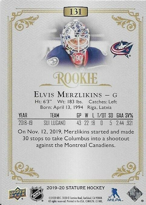 2019-20 Upper Deck Stature Elvis Merzlikins Rookie card 97/399