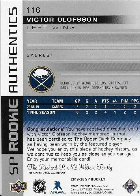 2019-20 Upper Deck SP Victor Olofsson Rookie Authentics jersey