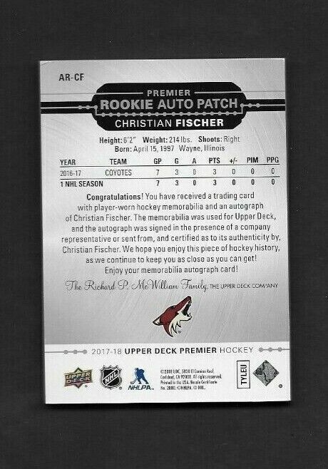 2017-18 Upper Deck Premier Christian Fischer Rookie Auto Patch Card 75/199