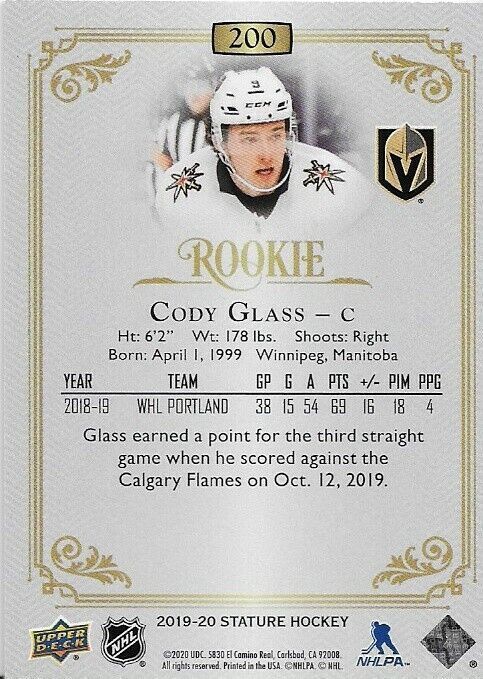 2019-20 Upper Deck Stature Cody Glass Rookie card 219/399