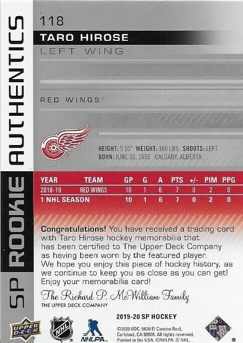 2019-20 Upper Deck SP Taro Hirose Rookie Authentics jersey