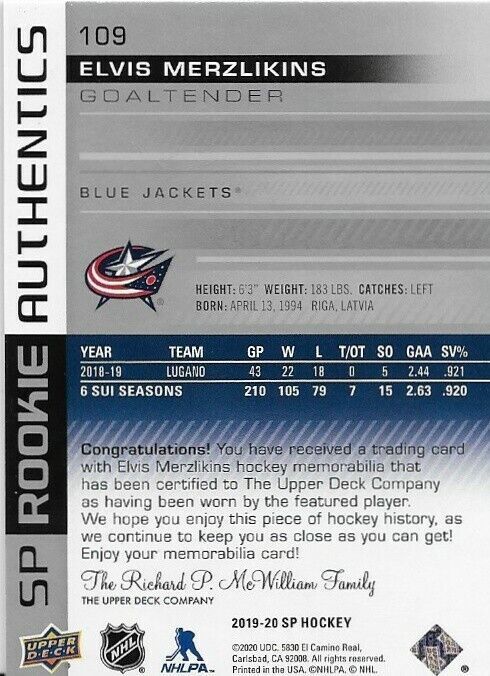 2019-20 Upper Deck SP Elvis Merzlikins Rookie Authentics jersey