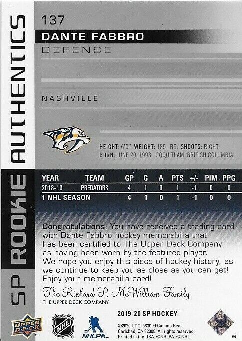 2019-20 Upper Deck SP Dante Fabbro Rookie Authentics jersey