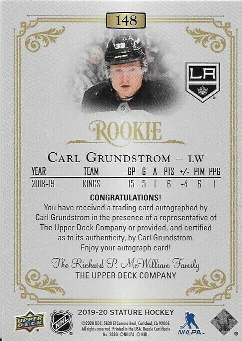 2019-20 Upper Deck Stature Carl Grundstrom Autographed Card 20/199