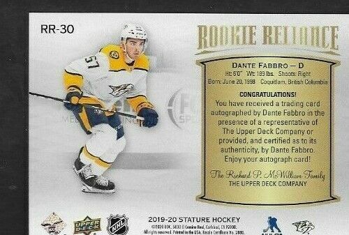 2019-20 Upper Deck Stature Dante Fabbro Rookie Reliance Autographed Card