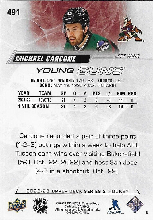 Signed Michael Carcone Young Guns 2022-23 UD Arizona Coyotes Rookie Card