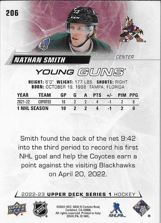 Signed Nathan Smith Young Guns 22-23 UD Arizona Coyotes Autographed Rookie Card