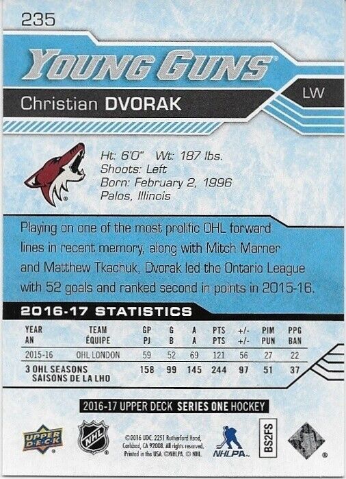 Autographed 2016-17 UD Arizona Coyotes Young Guns Christian Dvorak Rookie Card