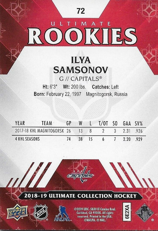 Signed Ilya Samsonov 18/19 UD Ultimate Rookie Washington Card #72 and 098/299