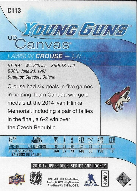 Signed Lawson Crouse UD Young Guns Canvas 2016-17 Arizona Coyotes Rookie Card