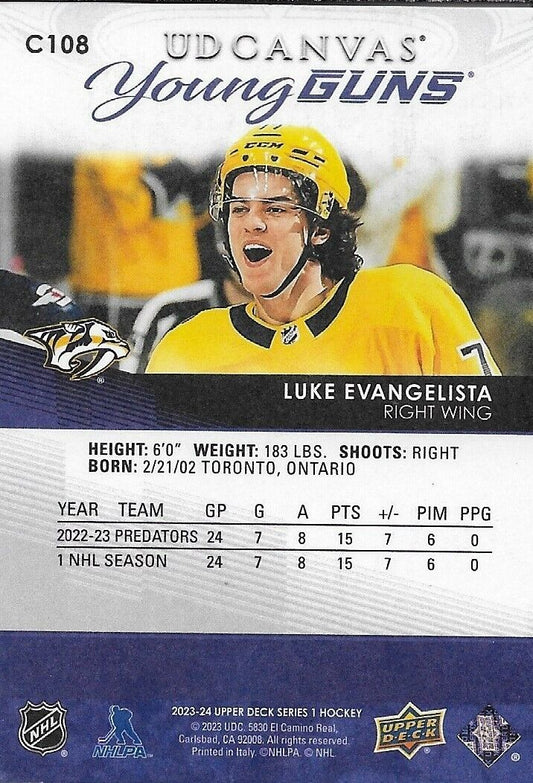 Signed Luke Evangelista UD Young Guns Canvas 2023-24 Nashville Rookie Card