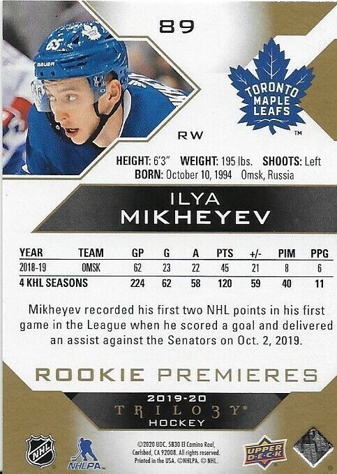 2019-20 Upper Deck Trilogy Ilya Mikheyev Rookie Premieres 126/499