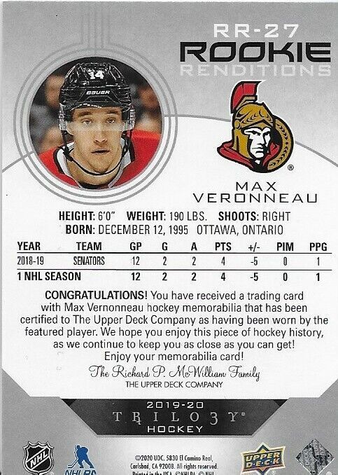 2019-20 Upper Deck Trilogy Max Veronneau Rookie renditions jersey parallel