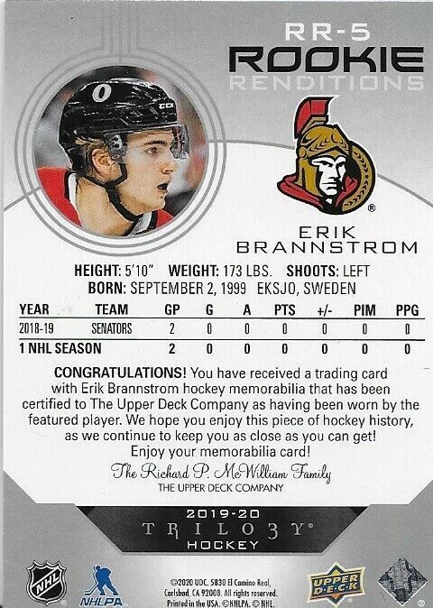 2019-20 Upper Deck Trilogy Erik Brannstrom Rookie renditions jersey parallel