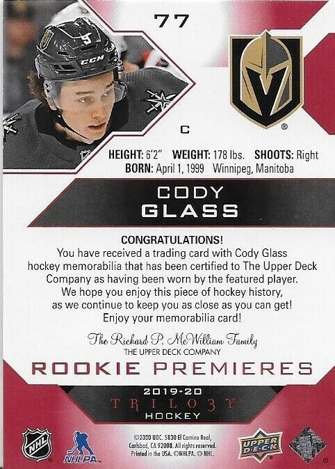 2019-20 Upper Deck Trilogy Cody Glass Rookie Premieres jersey Level 1 476/499