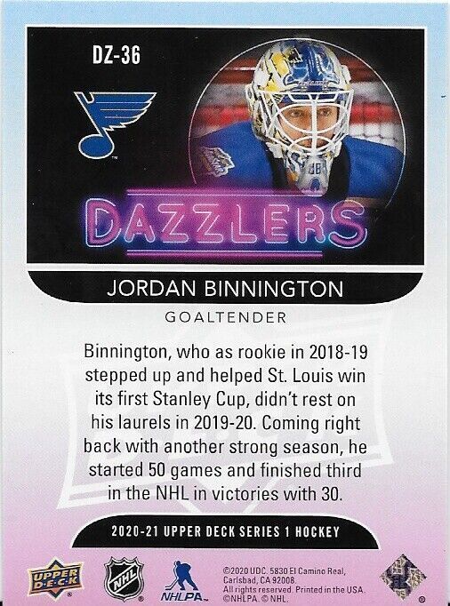 2020-21 Upper Deck Jordan Binnington Pink Parallel Dazzlers Card