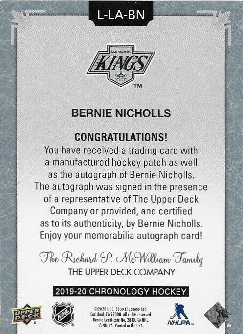 2020 Upper Deck Chronology Bernie Nicholls Autographed Letterman 14/25