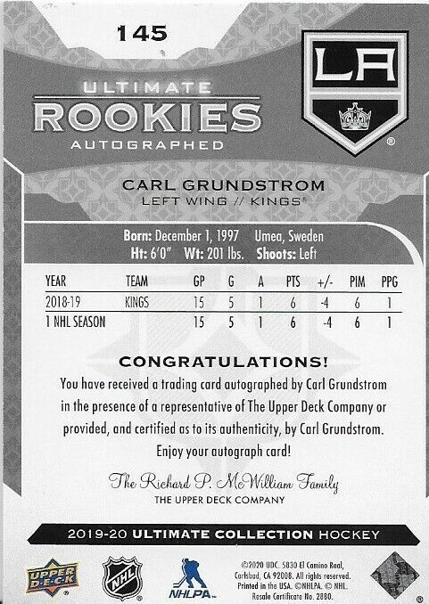 2019-20 Upper Deck Ultimate Rookie Autographed Carl Grundstrom 233/299