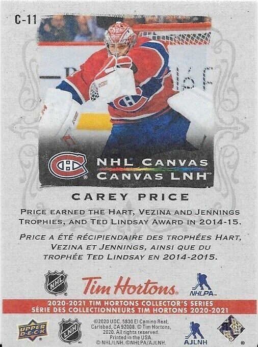 2020-21 UD Tim Horton's NHL Canvas Carey Price Insert Card