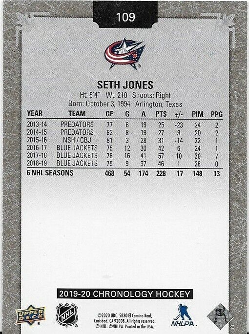 2020 Upper Deck Chronology Seth Jones Card 135/222 #109