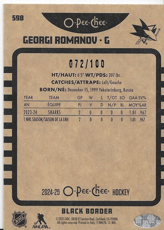 2024-25 O-Pee-Chee Georgi Romanov Retro Black Border RC San Jose Sharks 072/100