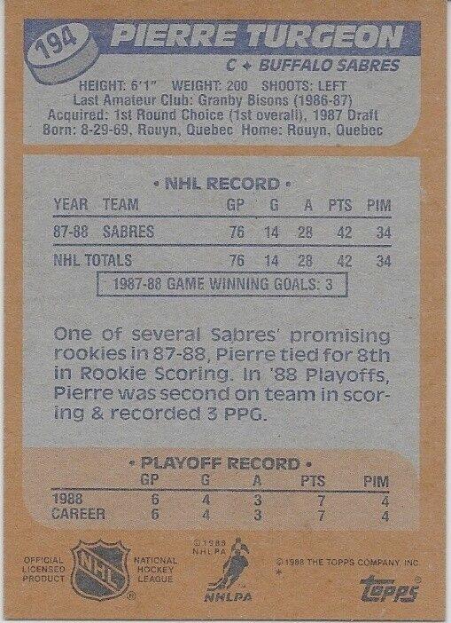 Auto. 1988 Topps Pierre Turgeon Buffalo Sabres Rookie Card Inscribed HOF 23