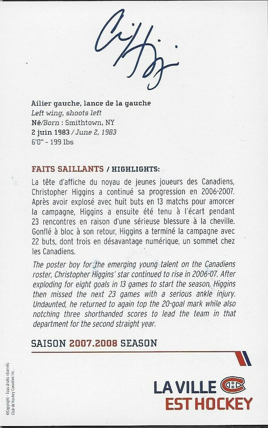 Auto. Chris Christopher Higgins Montreal Canadiens Postcard 2007-08 Original