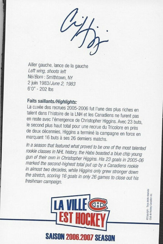 Auto. Chris Christopher Higgins Montreal Canadiens Postcard 2006-07 Original