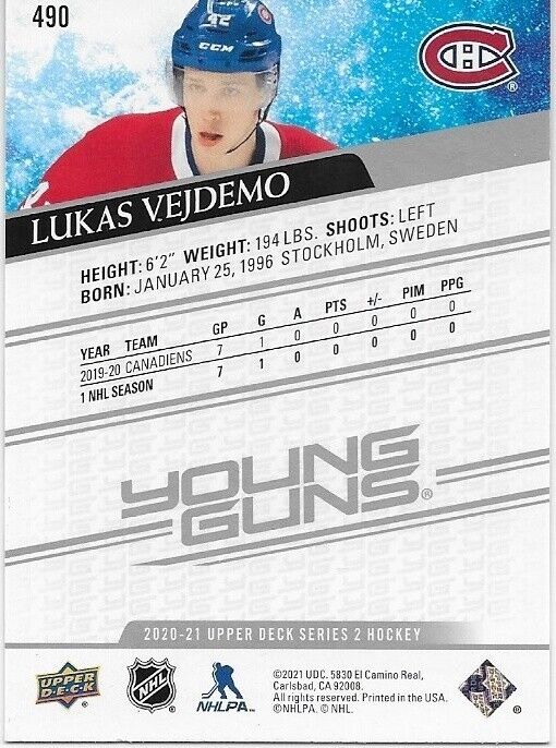 Signed 2020-21 UD Lukas Vejdemo Young Guns Montreal Canadiens Rookie Card