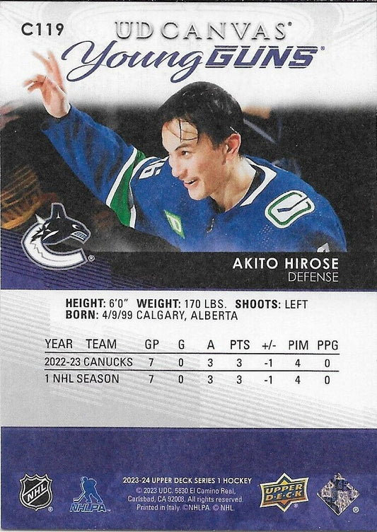 Signed Akito Hirose Young Guns 2023-24 UD Canvas Vancouver Canucks Rookie Card