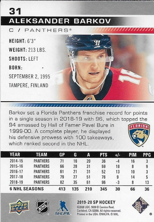 Signed Aleksander Barkov 2019/20 UD SP Hockey Florida Panthers Card #5 Original