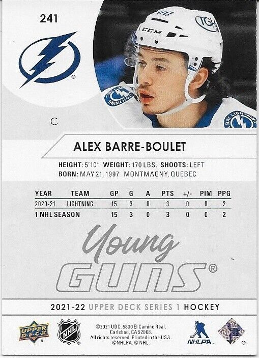 Signed Alex Barre Boulet 21-22 UD Young Guns Tampa Bay Lightning Rookie Card #1
