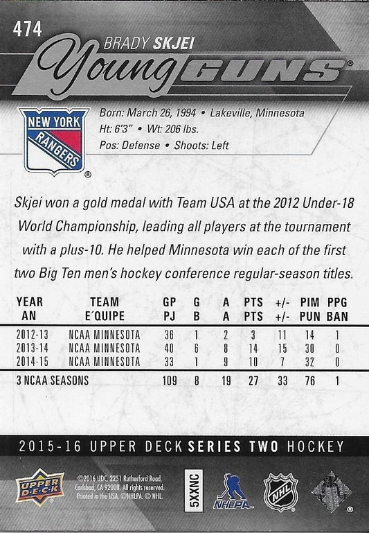 Signed Brady Skjei Young Guns 2015-16 Upper Deck New York Rangers Rookie Card