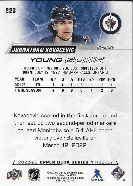 Signed Johnathan Kovacevic 2022/23 UD Young Guns Winnipeg Jets Rookie Card
