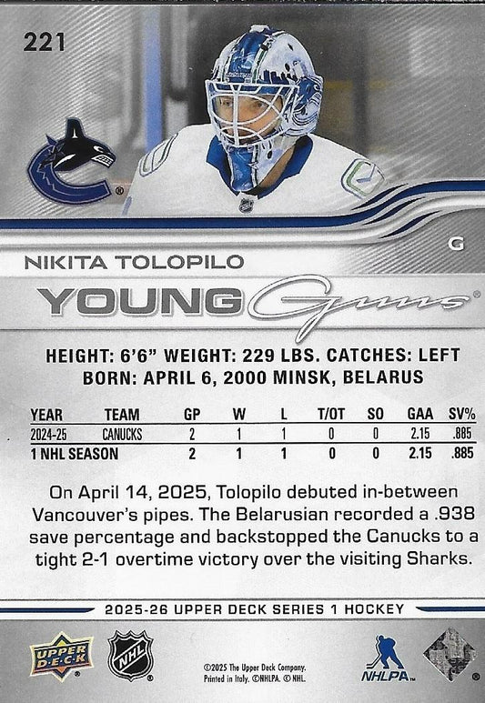 Signed Nikita Tolopilo Young Guns 2025-26 UD Vancouver Canucks Rookie Card