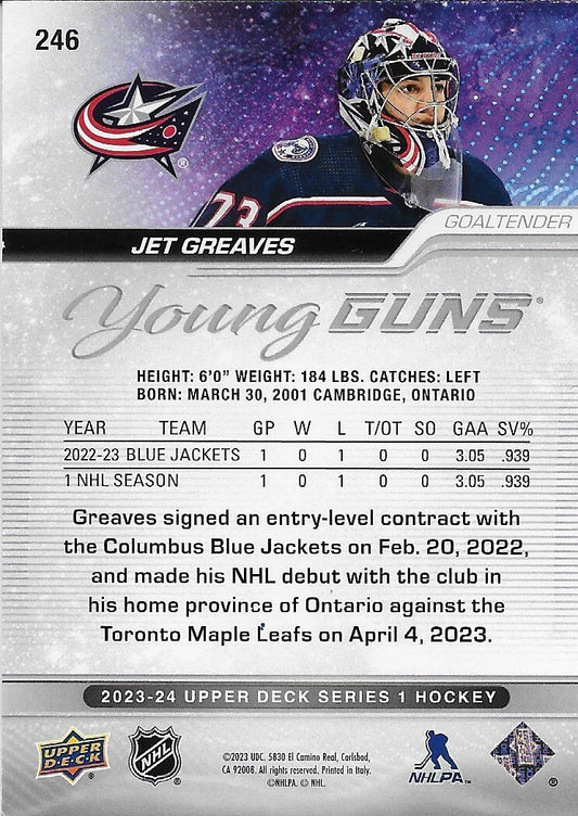 Signed Jet Greaves 2023-24 UD Columbus Blue Jackets Young Guns Rookie Card