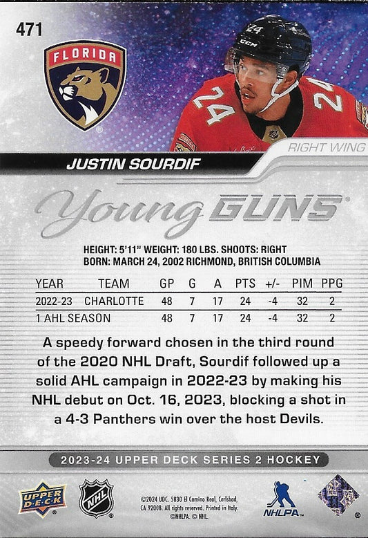 Signed Justin Sourdif 2023-24 UD Florida Panthers Young Guns Rookie Card