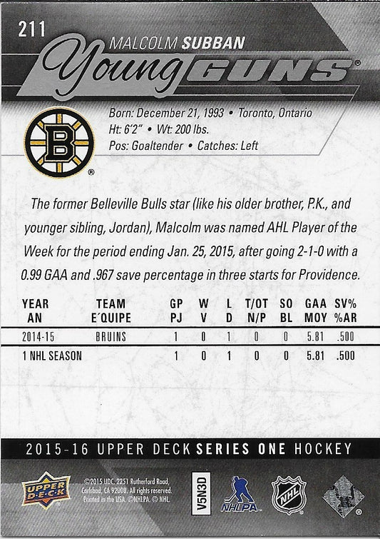 Signed Malcolm Subban Young Guns 2015-16 UD Boston Bruins Rookie Card Origin