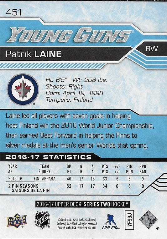 Signed Patrik Laine 2016-17 UD Winnipeg Jets Young Guns Rookie Card