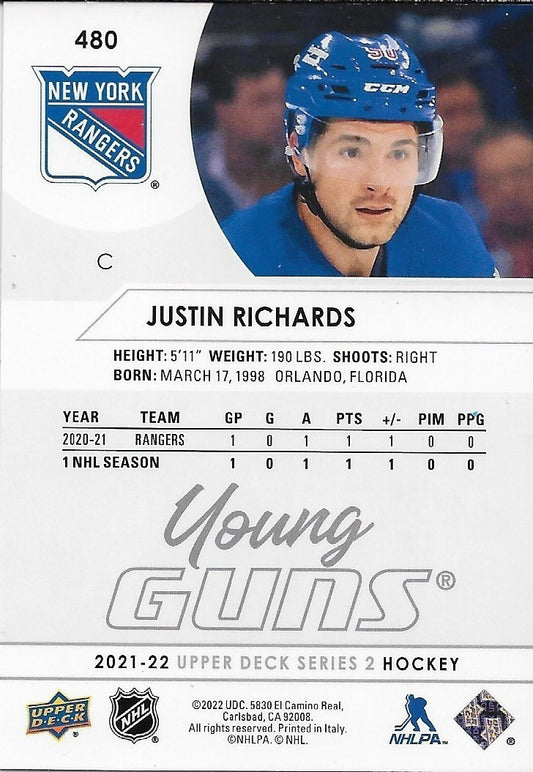 Signed Justin Richards 2021-22 UD New York Rangers Young Guns Rookie Card