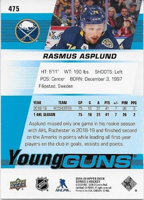 Signed Rasmus Asplund Young Guns 2019-20 UD Buffalo Sabres Rookie Card