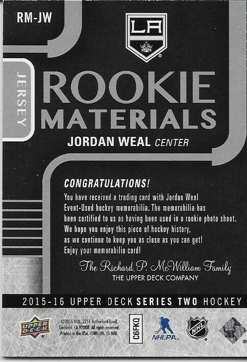 Signed Jordan Weal 15/16 UD Rookie Materials Los Angeles Kings Card Original