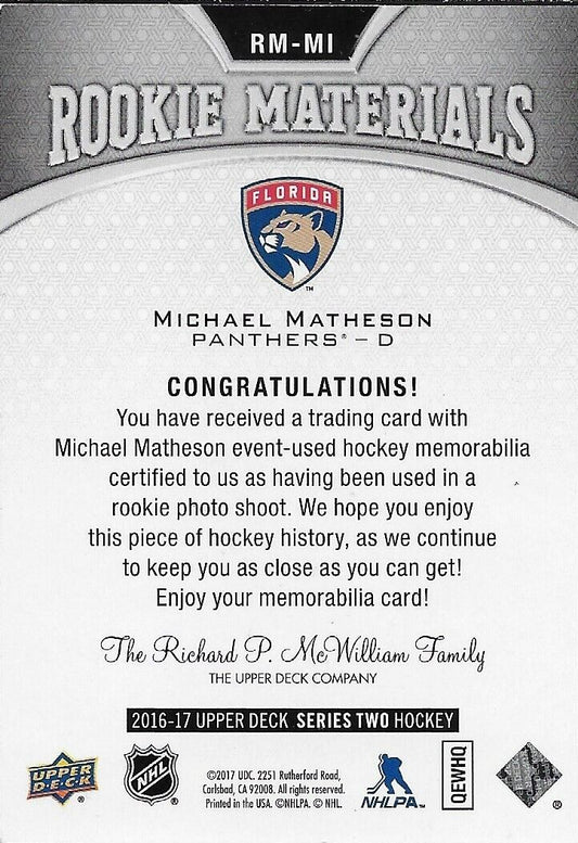 Signed Mike Matheson 16/17 UD Rookie Materials Florida Panthers Card RM-MI