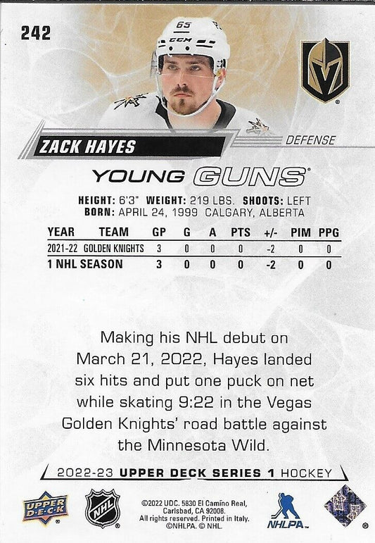Signed Zack Hayes 2022-23 UD Young Guns Vegas Golden Knights Rookie Card