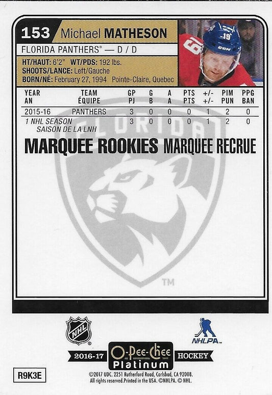 Signed Mike Matheson 16/17 O-Pee Chee Platinum Florida Panthers Card #153