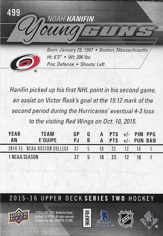 Signed Noah Hanifin 2015-16 UD Young Guns Carolina Hurricanes Rookie Card