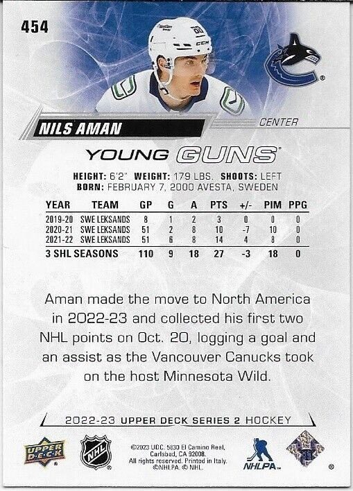 Signed Nils Aman Young Guns 22-23 UD Vancouver Canucks Autographed Rookie Card