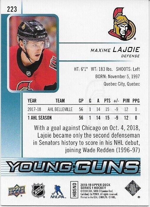 Autographed 18-19 UD Ottawa Senators Young Guns Maxime Lajoie Signed Rookie Card