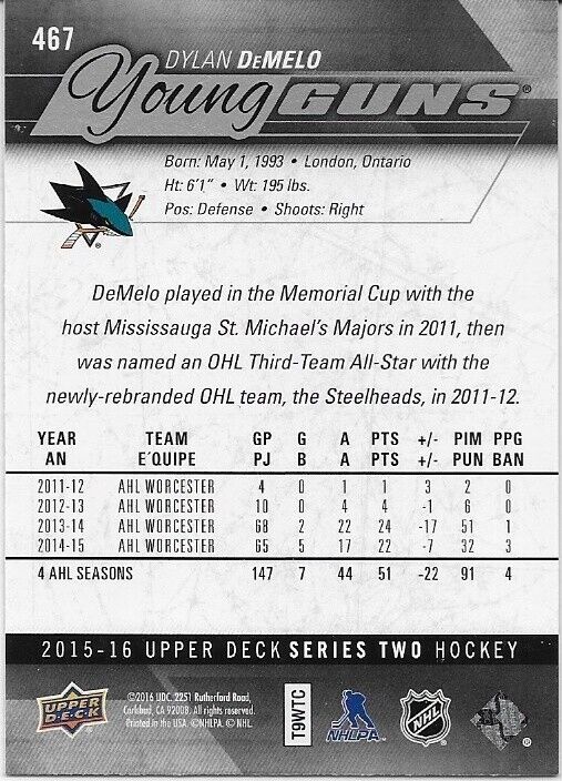 Autographed 15-16 UD San Jose Sharks Young Guns Dylan DeMelo Signed Rookie Card